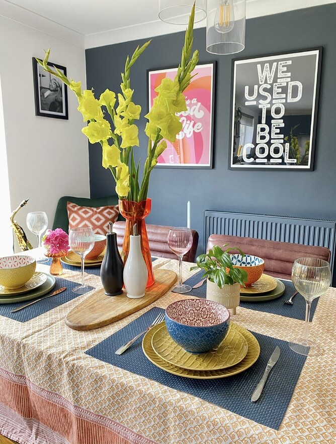This uses three colours that are evenly spaced around the colour wheel, such as red, yellow and blue. This balance offers a vibrant and lively palette, ideal for playful and energetic spaces such as a table setting (as above).