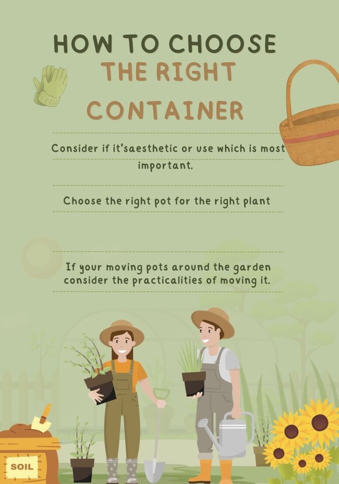 Container gardening offers a wide range of options in terms of container types, each with its own advantages and considerations they can vary in shape and size. While ceramic, clay and terracotta containers may offer aesthetic appeal, many gardeners prefer using plastic pots due to their lighter weight and ability to retain moisture more effectively. However, the choice of material ultimately depends on personal preference and specific gardener needs. Additionally, creative alternatives such as wooden containers or repurposed items such as old wellies which I have used can add a touch of uniqueness and enjoyment to the gardening experience.