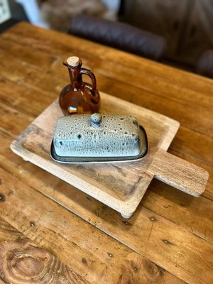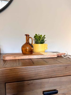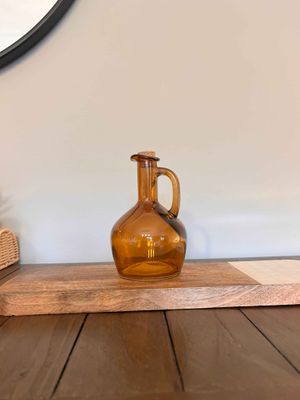 Beautiful brown glass pouring jar for oil or vinegar finished off with a cork stopper.