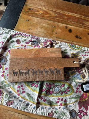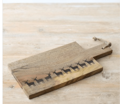 Natural wood chopping board with a striking engraved images of reindeers. The practical board can also be used a serving board. A striking piece that would grace any home