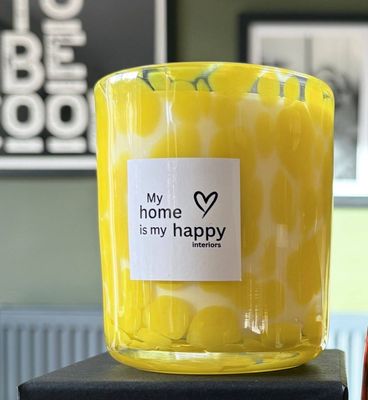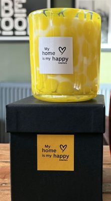 Velvet Suede is the scent. The vessel is yellow mottled glass. Unique gift.